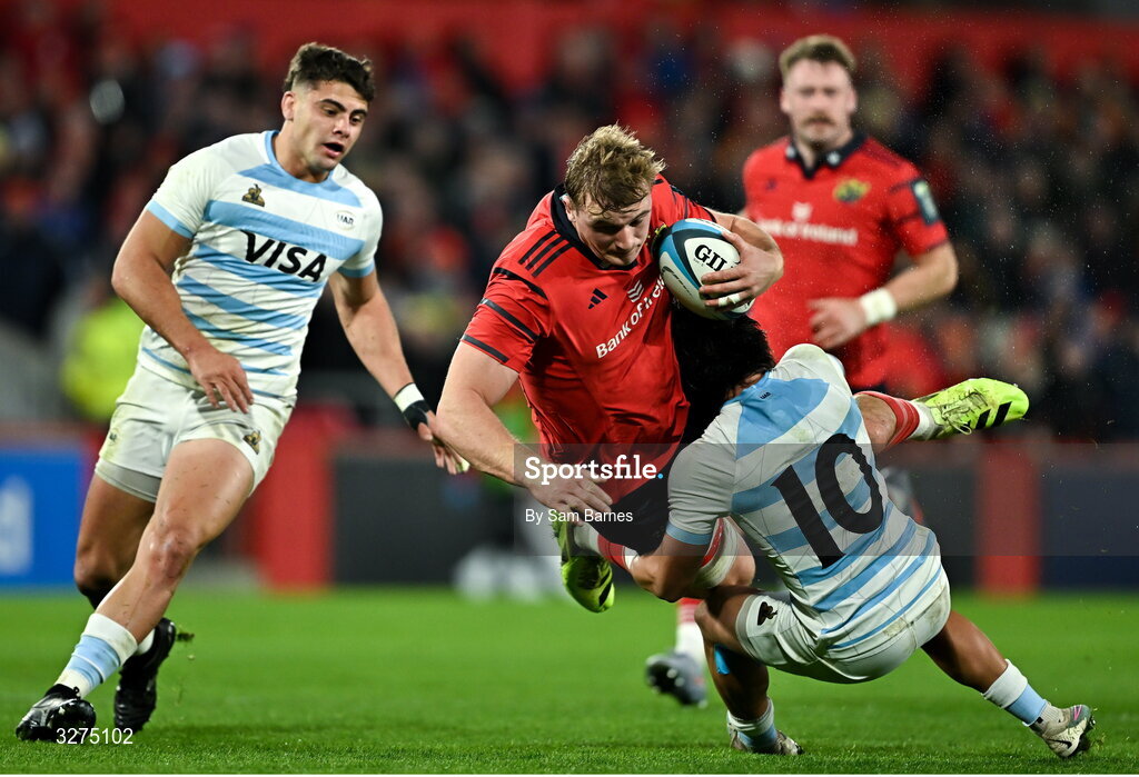 1 November 2025; Gavin Coombes of Munster is tackled by Julian Hernandez of Argentina XV during the tour match between Munster and Argentina XV at Thomond Park in Limerick. Photo by Sam Barnes/Sportsfile