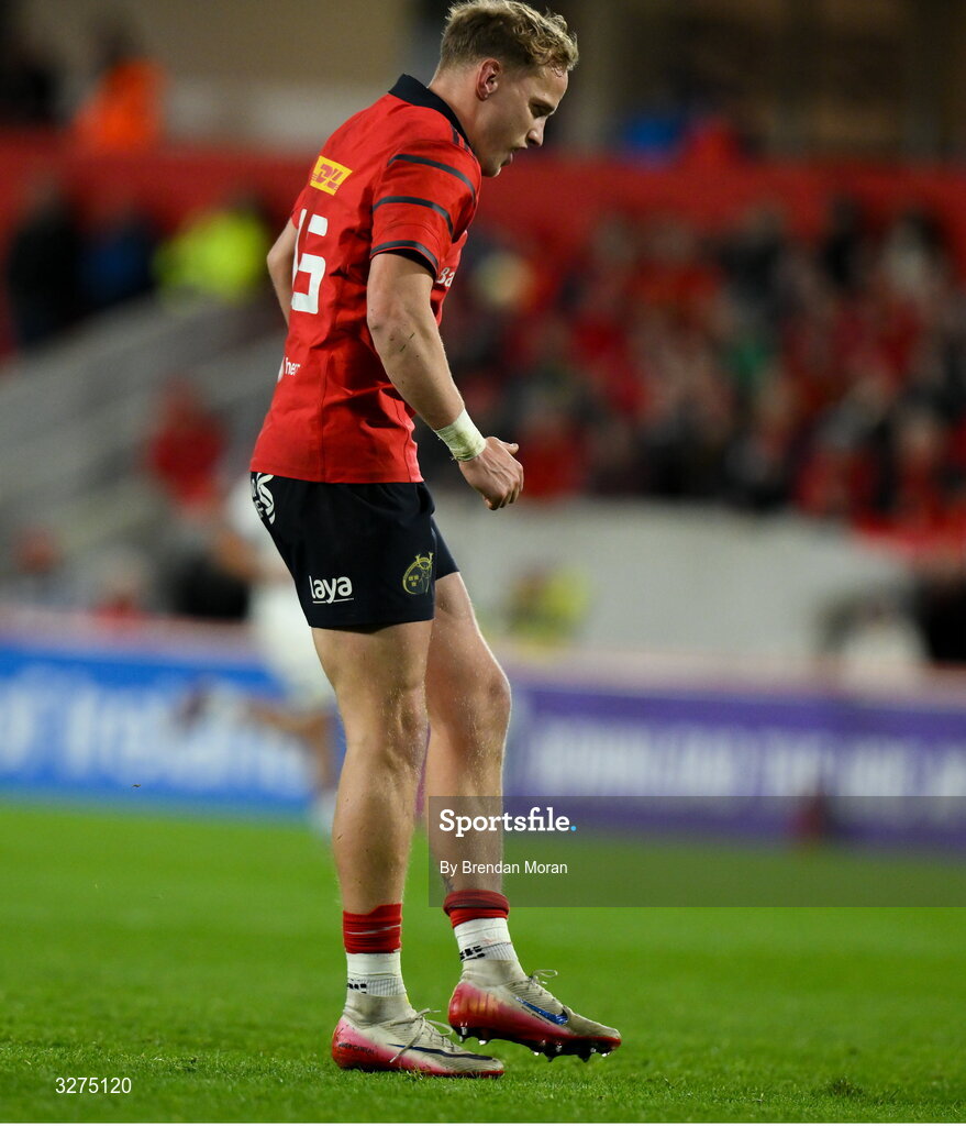 1 November 2025; Mike Haley of Munster limps before leaving the pitch with an injury during the tour match between Munster and Argentina XV at Thomond Park in Limerick. Photo by Brendan Moran/Sportsfile