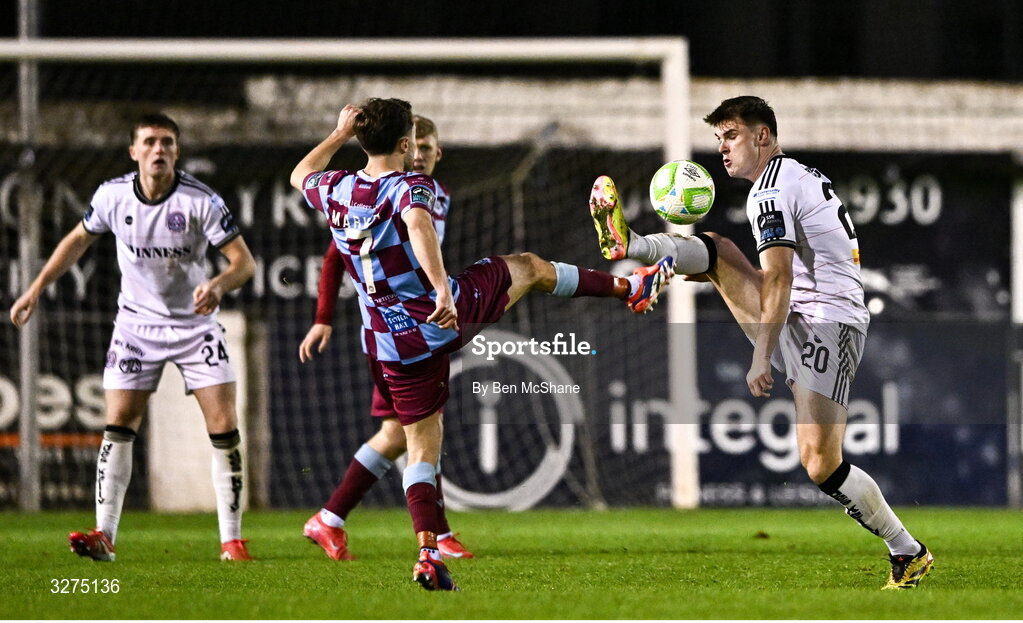1 November 2025; Leigh Kavanagh of Bohemians in action against Darragh Markey of Drogheda United during the SSE Airtricity Men's Premier Division match between Drogheda United and Bohemians at Sullivan & Lambe Park in Drogheda, Louth. Photo by Ben McShane/Sportsfile