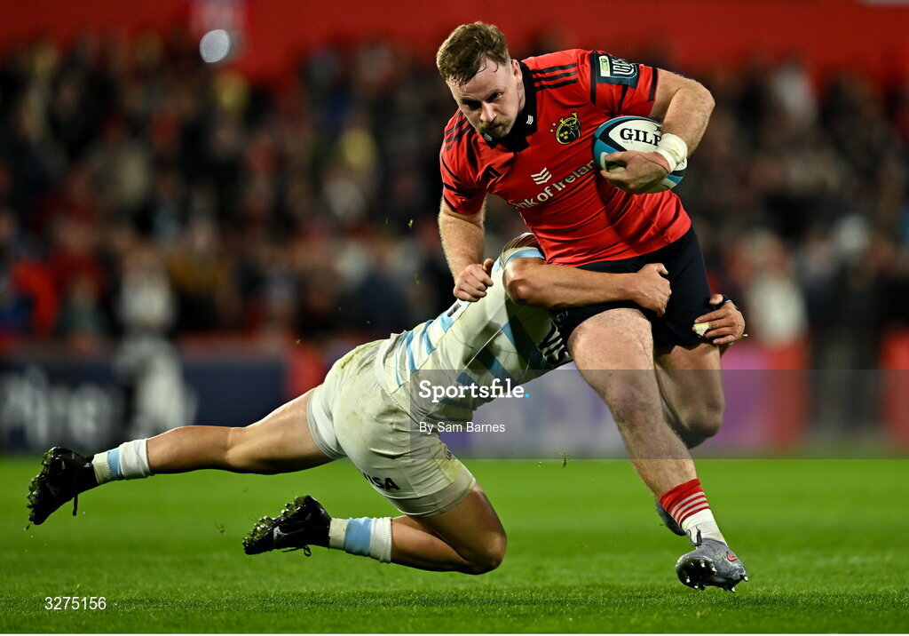 1 November 2025; Sean O'Brien of Munster is tackled by Faustino Sanchez Valarolo of Argentina XV during the tour match between Munster and Argentina XV at Thomond Park in Limerick. Photo by Sam Barnes/Sportsfile