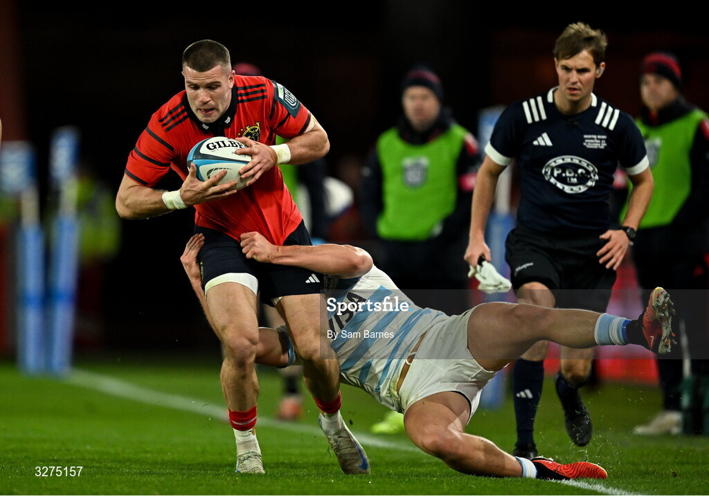 1 November 2025; Diarmuid Kilgallen of Munster is tackled by Santiago Pernas of Argentina XV during the tour match between Munster and Argentina XV at Thomond Park in Limerick. Photo by Sam Barnes/Sportsfile