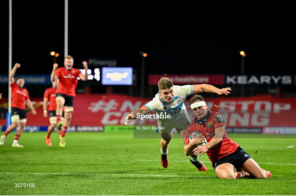 1 November 2025; Tony Butler of Munster scores his side's second try despite the efforts of Santiago Pernas of Argentina XV during the tour match between Munster and Argentina XV at Thomond Park in Limerick. Photo by Sam Barnes/Sportsfile