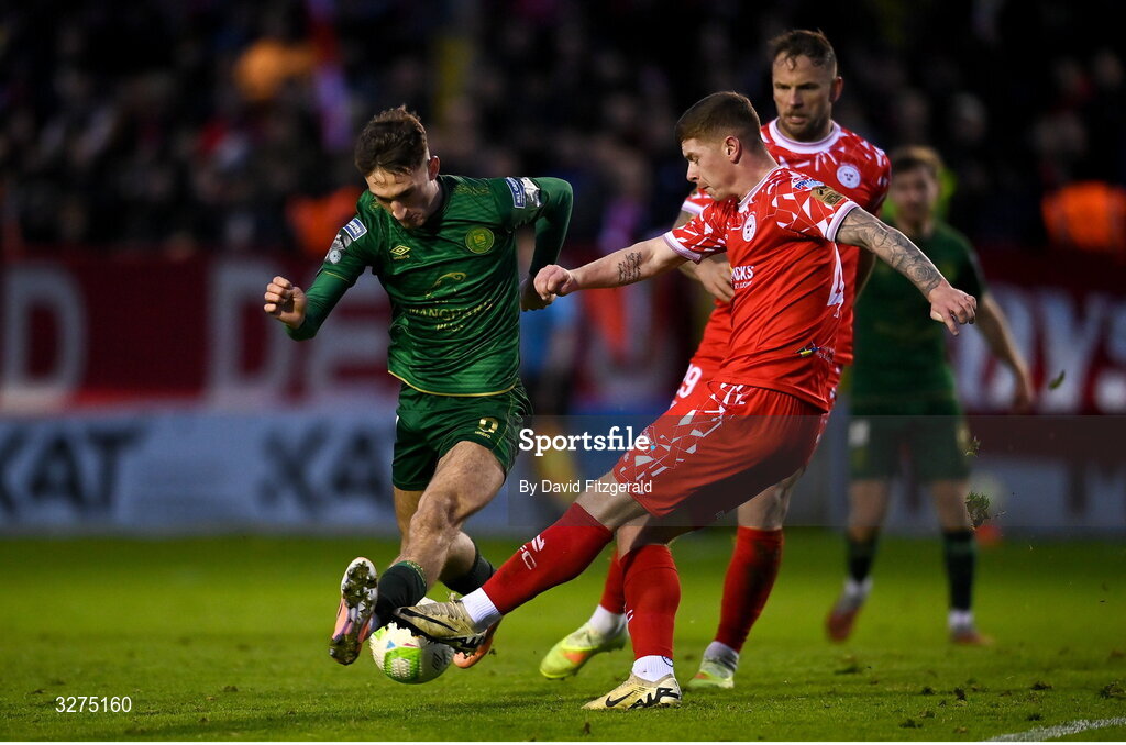 1 November 2025; Mason Melia of St Patrick's Athletic in action against Kameron Ledwidge of Shelbourne during the SSE Airtricity Men's Premier Division match between Shelbourne and St Patrick's Athletic at Tolka Park in Dublin. Photo by David Fitzgerald/Sportsfile
