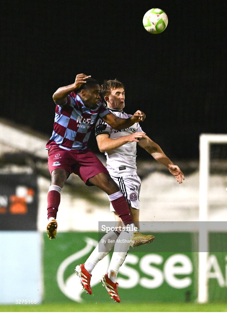1 November 2025; Cian Byrne of Bohemians in action against Thomas Oluwa of Drogheda United during the SSE Airtricity Men's Premier Division match between Drogheda United and Bohemians at Sullivan & Lambe Park in Drogheda, Louth. Photo by Ben McShane/Sportsfile