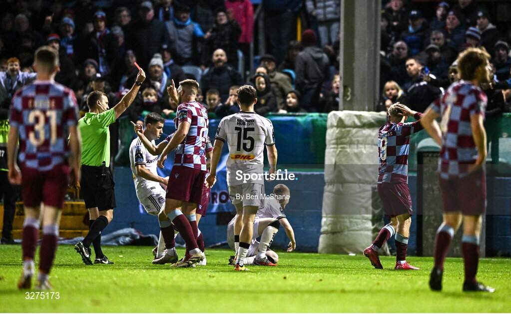 1 November 2025; Josh Thomas of Drogheda United, right, is sent off by referee Paul Norton during the SSE Airtricity Men's Premier Division match between Drogheda United and Bohemians at Sullivan & Lambe Park in Drogheda, Louth. Photo by Ben McShane/Sportsfile