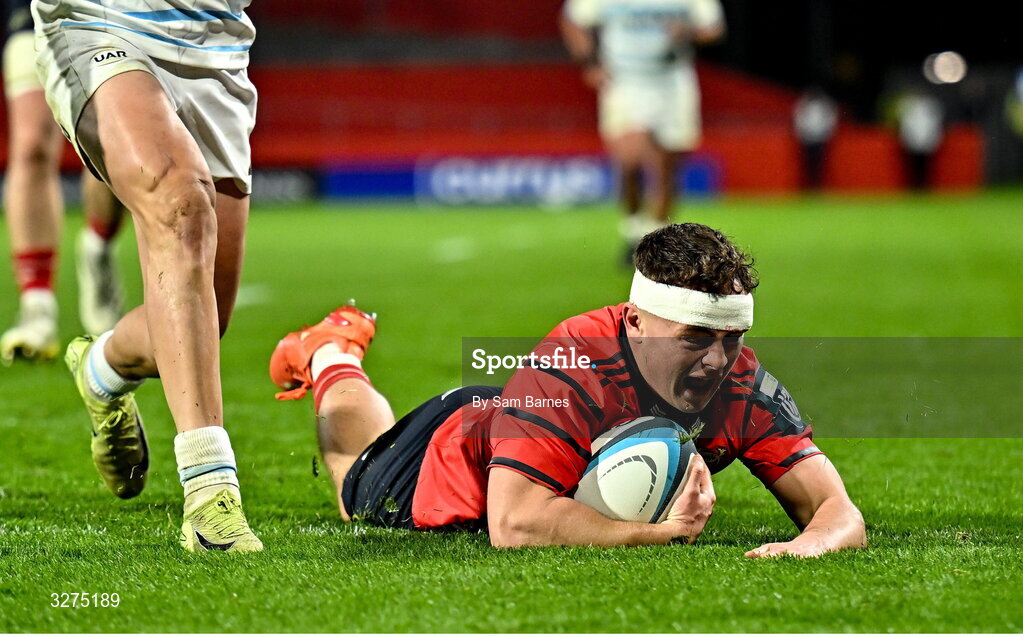 1 November 2025; Tony Butler of Munster scores his side's fourth try during the tour match between Munster and Argentina XV at Thomond Park in Limerick. Photo by Sam Barnes/Sportsfile