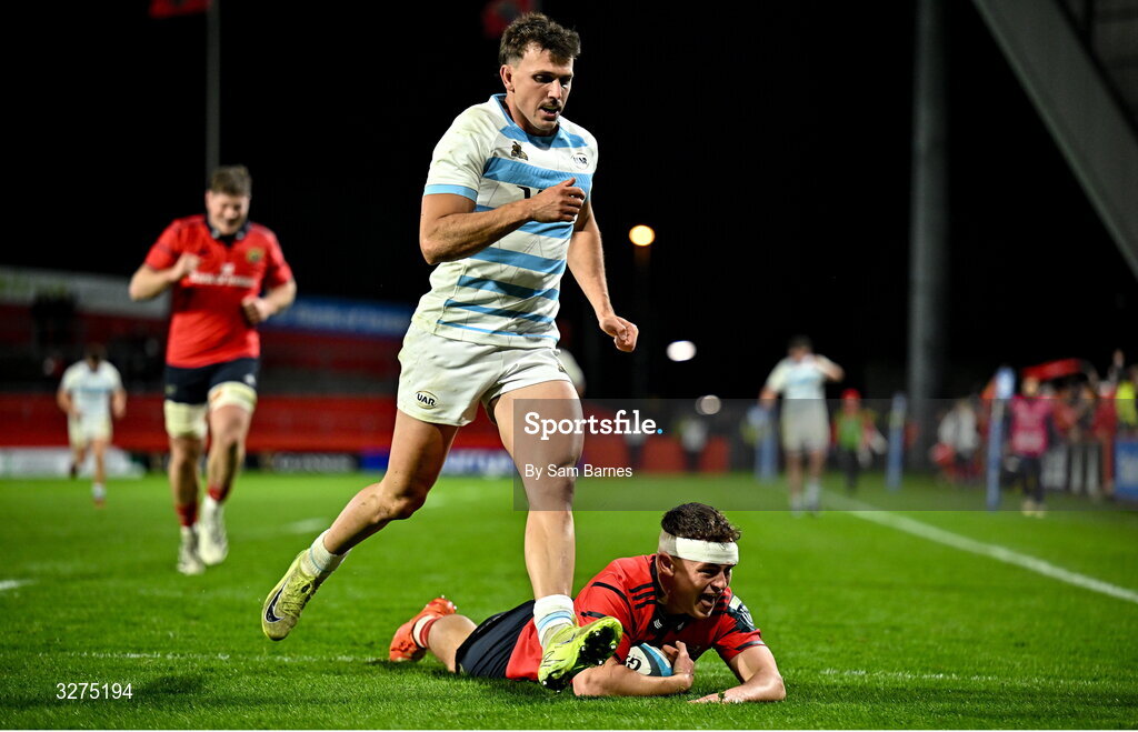 1 November 2025; Tony Butler of Munster scores his side's fourth try despite the efforts of Tobias Wade of Argentina XV during the tour match between Munster and Argentina XV at Thomond Park in Limerick. Photo by Sam Barnes/Sportsfile