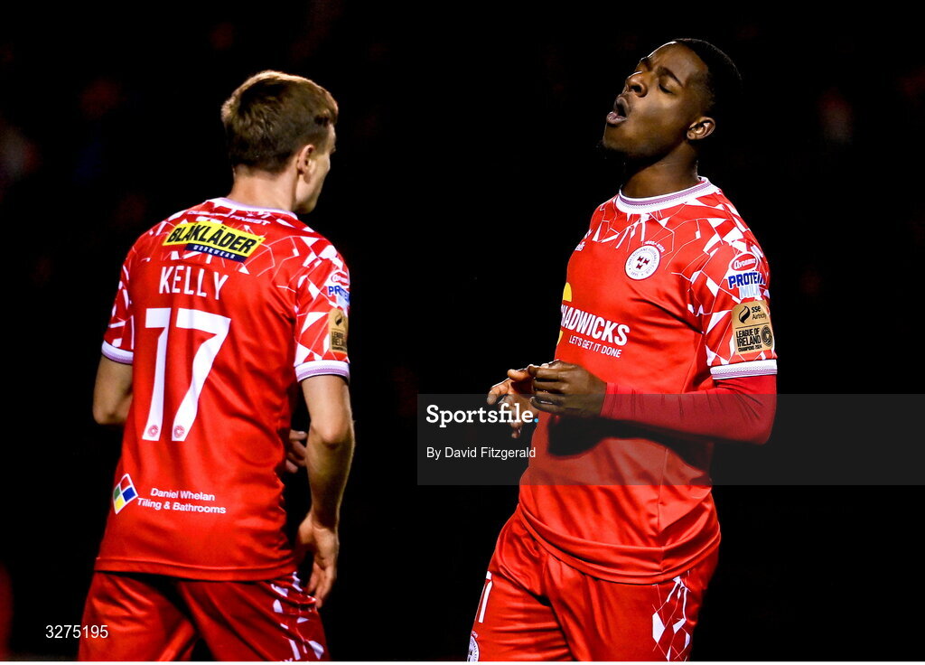 1 November 2025; Mipo Odubeko of Shelbourne reacts after hitting the crossbar during the SSE Airtricity Men's Premier Division match between Shelbourne and St Patrick's Athletic at Tolka Park in Dublin. Photo by David Fitzgerald/Sportsfile