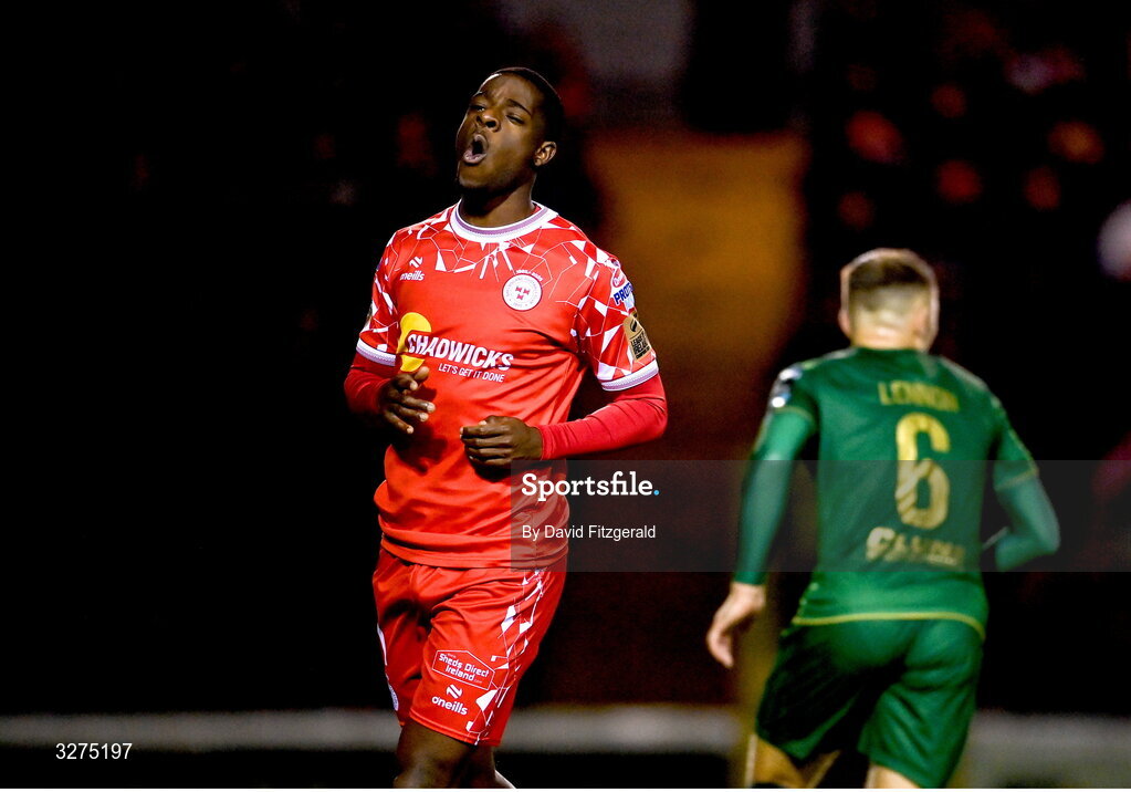 1 November 2025; Mipo Odubeko of Shelbourne reacts after hitting the crossbar during the SSE Airtricity Men's Premier Division match between Shelbourne and St Patrick's Athletic at Tolka Park in Dublin. Photo by David Fitzgerald/Sportsfile