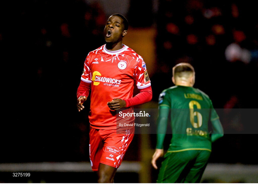 1 November 2025; Mipo Odubeko of Shelbourne reacts after hitting the crossbar during the SSE Airtricity Men's Premier Division match between Shelbourne and St Patrick's Athletic at Tolka Park in Dublin. Photo by David Fitzgerald/Sportsfile