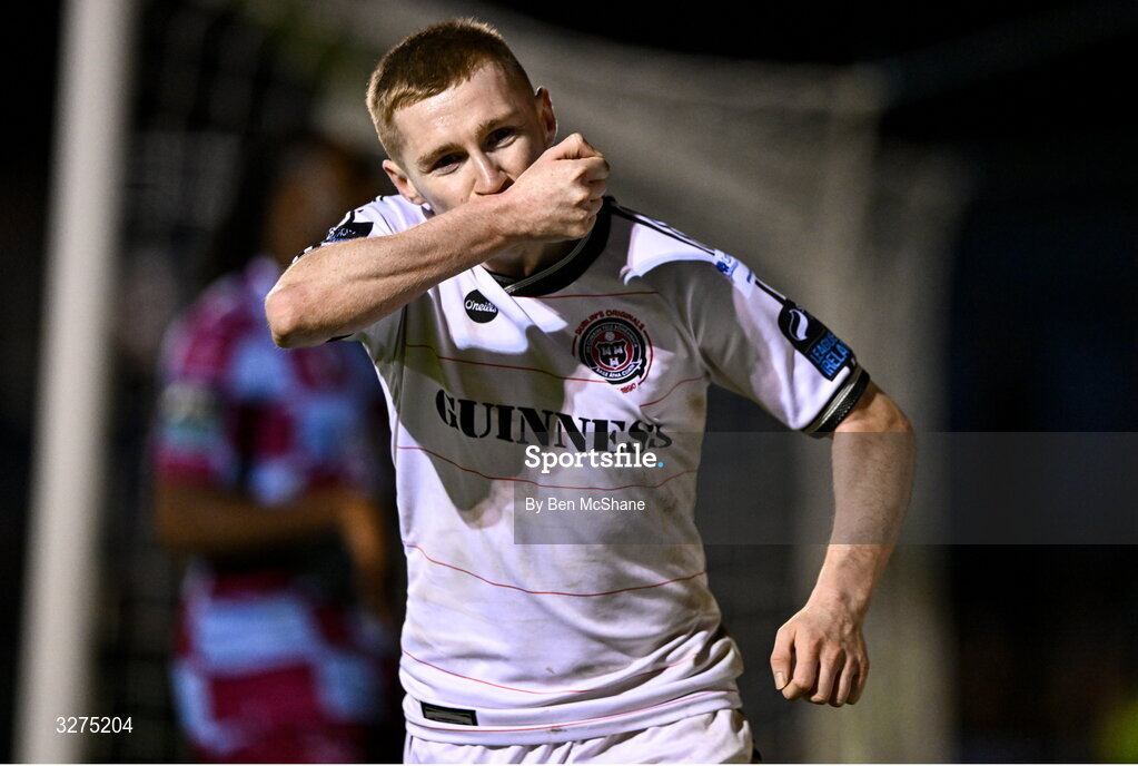 1 November 2025; Ross Tierney of Bohemians celebrates after scoring his side's fourth goal during the SSE Airtricity Men's Premier Division match between Drogheda United and Bohemians at Sullivan & Lambe Park in Drogheda, Louth. Photo by Ben McShane/Sportsfile