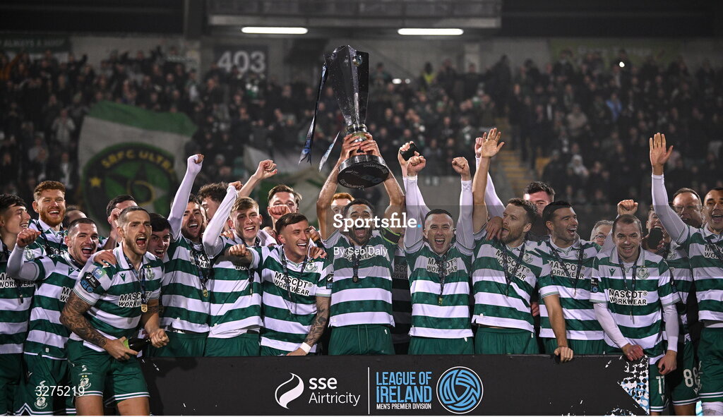 1 November 2025; Roberto Lopes of Shamrock Rovers lifts the SSE Airtricity Men's Premier Division trophy after the SSE Airtricity Men's Premier Division match between Shamrock Rovers and Sligo Rovers at Tallaght Stadium in Dublin. Photo by Seb Daly/Sportsfile