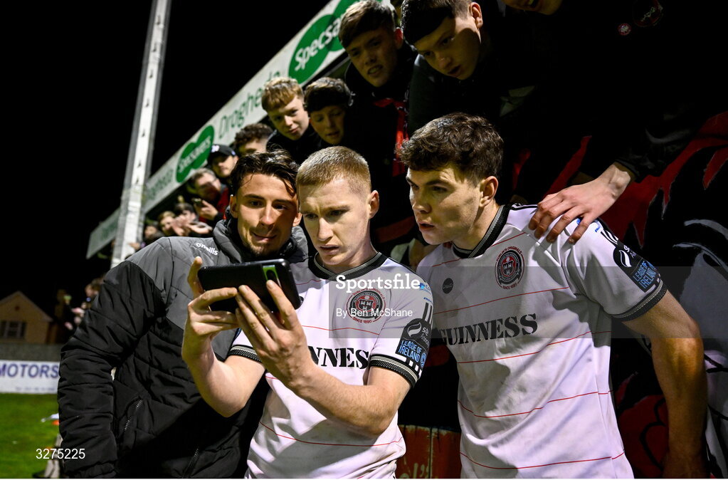 1 November 2025; Bohemians players, from left, Connor Parsons, Ross Tierney and James Clarke and Bohemians supporters view a smartphone for the closing minutes of the Shelbourne v St Patrick's Athletic match after the SSE Airtricity Men's Premier Division match between Drogheda United and Bohemians at Sullivan & Lambe Park in Drogheda, Louth. Photo by Ben McShane/Sportsfile