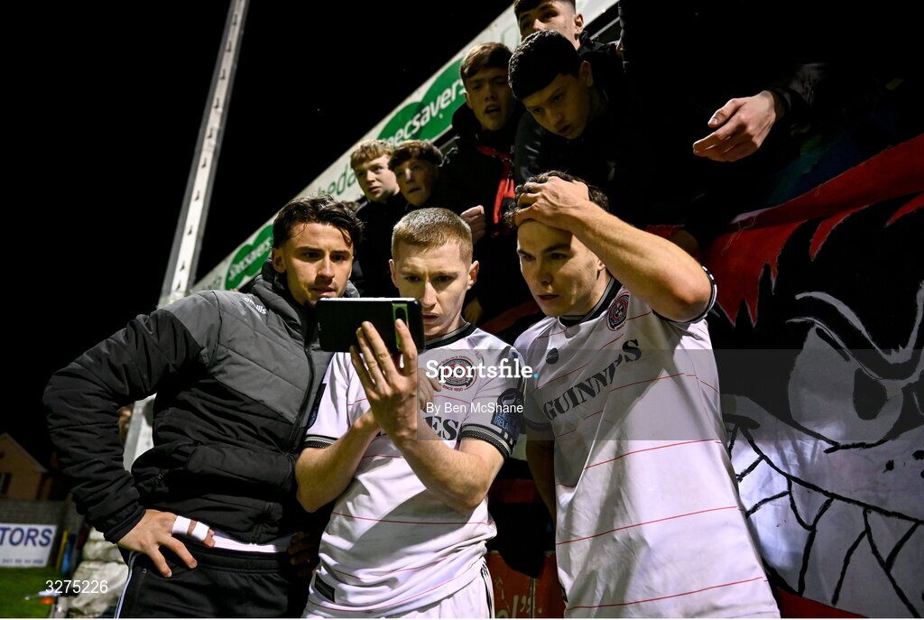 1 November 2025; Bohemians players, from left, Connor Parsons, Ross Tierney and James Clarke and Bohemians supporters view a smartphone for the closing minutes of the Shelbourne v St Patrick's Athletic match after the SSE Airtricity Men's Premier Division match between Drogheda United and Bohemians at Sullivan & Lambe Park in Drogheda, Louth. Photo by Ben McShane/Sportsfile