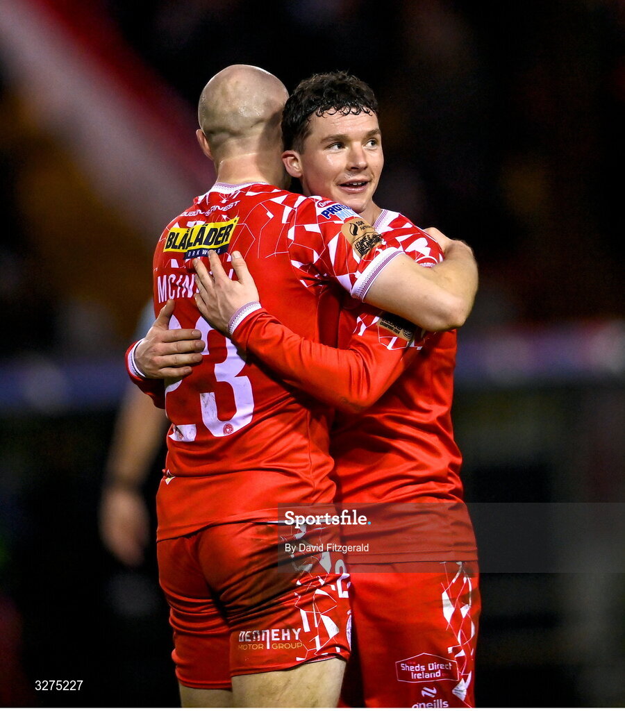 1 November 2025; Ali Coote, right, and Kerr McInroy of Shelbourne after the SSE Airtricity Men's Premier Division match between Shelbourne and St Patrick's Athletic at Tolka Park in Dublin. Photo by David Fitzgerald/Sportsfile