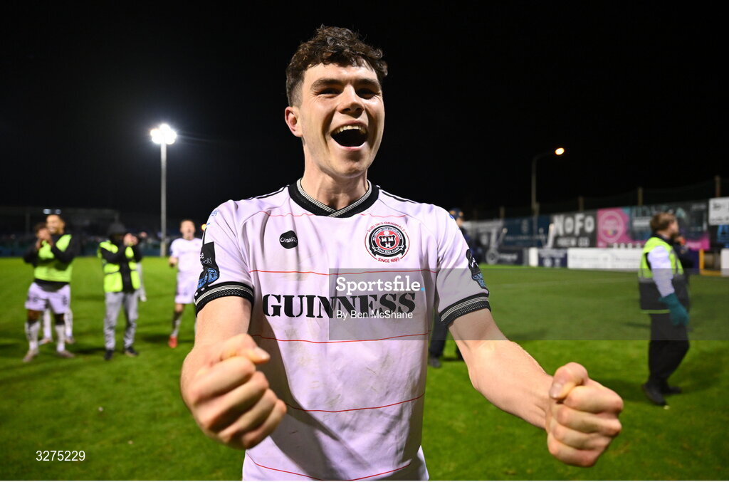 1 November 2025; James Clarke of Bohemians celebrates after the SSE Airtricity Men's Premier Division match between Drogheda United and Bohemians at Sullivan & Lambe Park in Drogheda, Louth. Photo by Ben McShane/Sportsfile