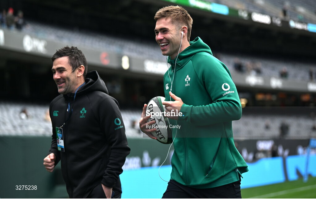1 November 2025; Jack Crowley of Ireland, right, and Ireland Head of Analytics and Innovation Vinny Hammond before the Gallagher Cup match between Ireland and New Zealand at Soldier Field in Chicago, USA. Photo by Ramsey Cardy/Sportsfile