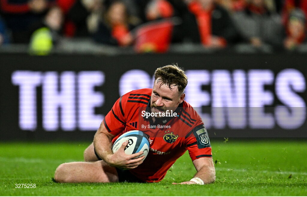 1 November 2025; Sean O'Brien of Munster scores his side's fifth try during the tour match between Munster and Argentina XV at Thomond Park in Limerick. Photo by Sam Barnes/Sportsfile