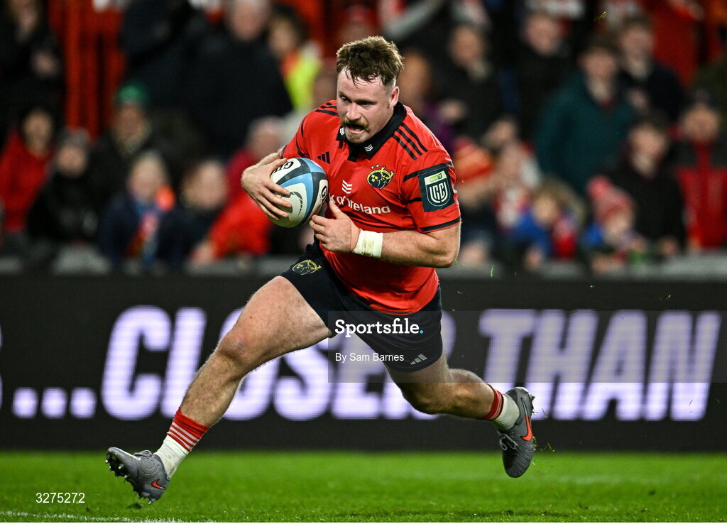 1 November 2025; Sean O'Brien of Munster scores his side's fifth try during the tour match between Munster and Argentina XV at Thomond Park in Limerick. Photo by Sam Barnes/Sportsfile