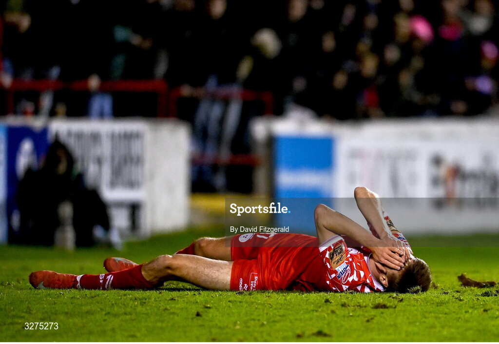 1 November 2025; Daniel Kelly of Shelbourne reacts after a missed opportunity during the SSE Airtricity Men's Premier Division match between Shelbourne and St Patrick's Athletic at Tolka Park in Dublin. Photo by David Fitzgerald/Sportsfile