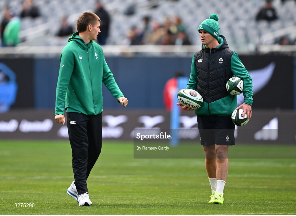 1 November 2025; Sam Prendergast of Ireland, left, and assistant coach Jonathan Sexton before the Gallagher Cup match between Ireland and New Zealand at Soldier Field in Chicago, USA. Photo by Ramsey Cardy/Sportsfile