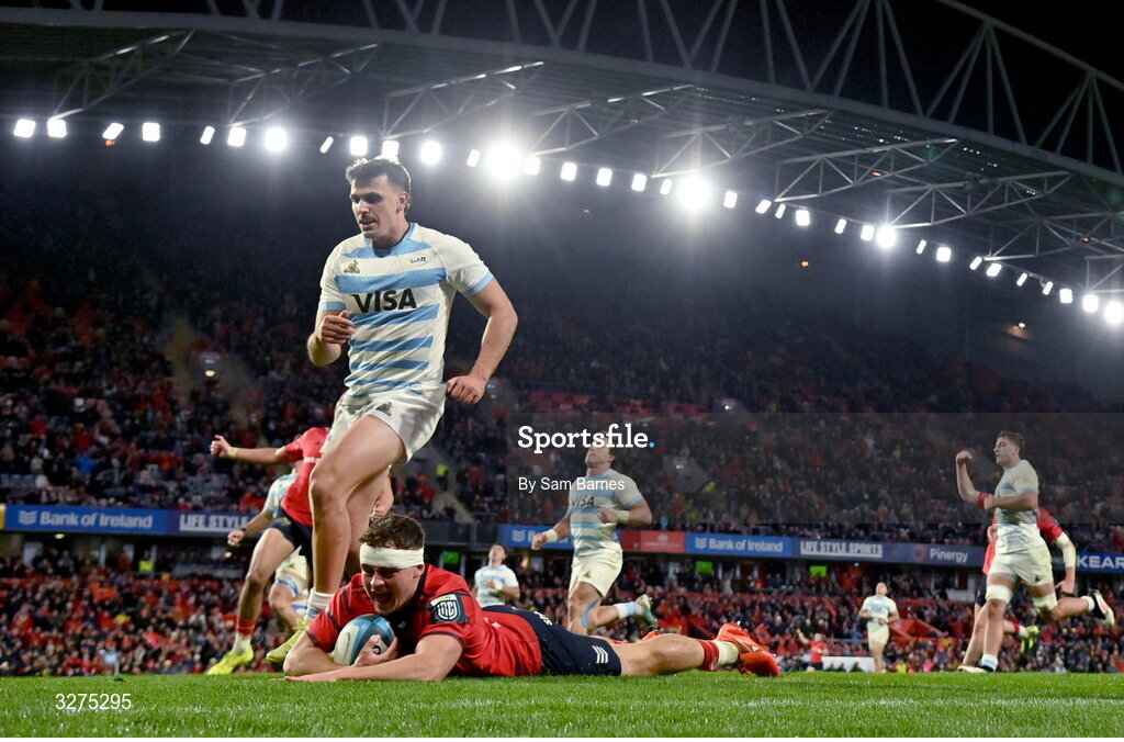 1 November 2025; Tony Butler of Munster scores his side's fourth try during the tour match between Munster and Argentina XV at Thomond Park in Limerick. Photo by Sam Barnes/Sportsfile