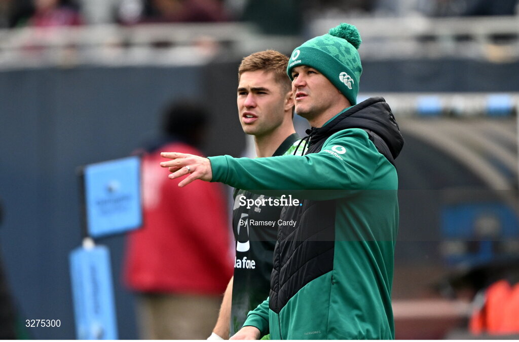 1 November 2025; Jack Crowley of Ireland, left, and assistant coach Jonathan Sexton before the Gallagher Cup match between Ireland and New Zealand at Soldier Field in Chicago, USA. Photo by Ramsey Cardy/Sportsfile