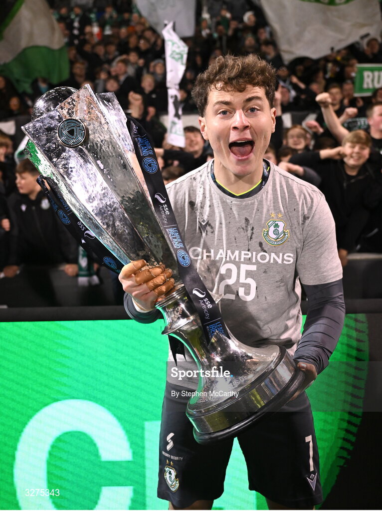 1 November 2025; Shamrock Rovers goalkeeper Ed McGinty celebrates with the SSE Airtricity Men's Premier Division trophy after the SSE Airtricity Men's Premier Division match between Shamrock Rovers and Sligo Rovers at Tallaght Stadium in Dublin. Photo by Stephen McCarthy/Sportsfile