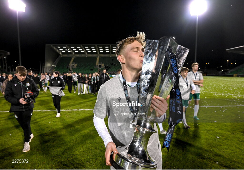 1 November 2025; Michael Noonan of Shamrock Rovers celebrates with the SSE Airtricity Men's Premier Division trophy after the SSE Airtricity Men's Premier Division match between Shamrock Rovers and Sligo Rovers at Tallaght Stadium in Dublin. Photo by Stephen McCarthy/Sportsfile