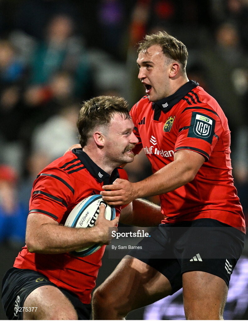 1 November 2025; Sean O'Brien of Munster, left, celebrates with teammate Max Clein after scoring their side's fifth try during the tour match between Munster and Argentina XV at Thomond Park in Limerick. Photo by Sam Barnes/Sportsfile