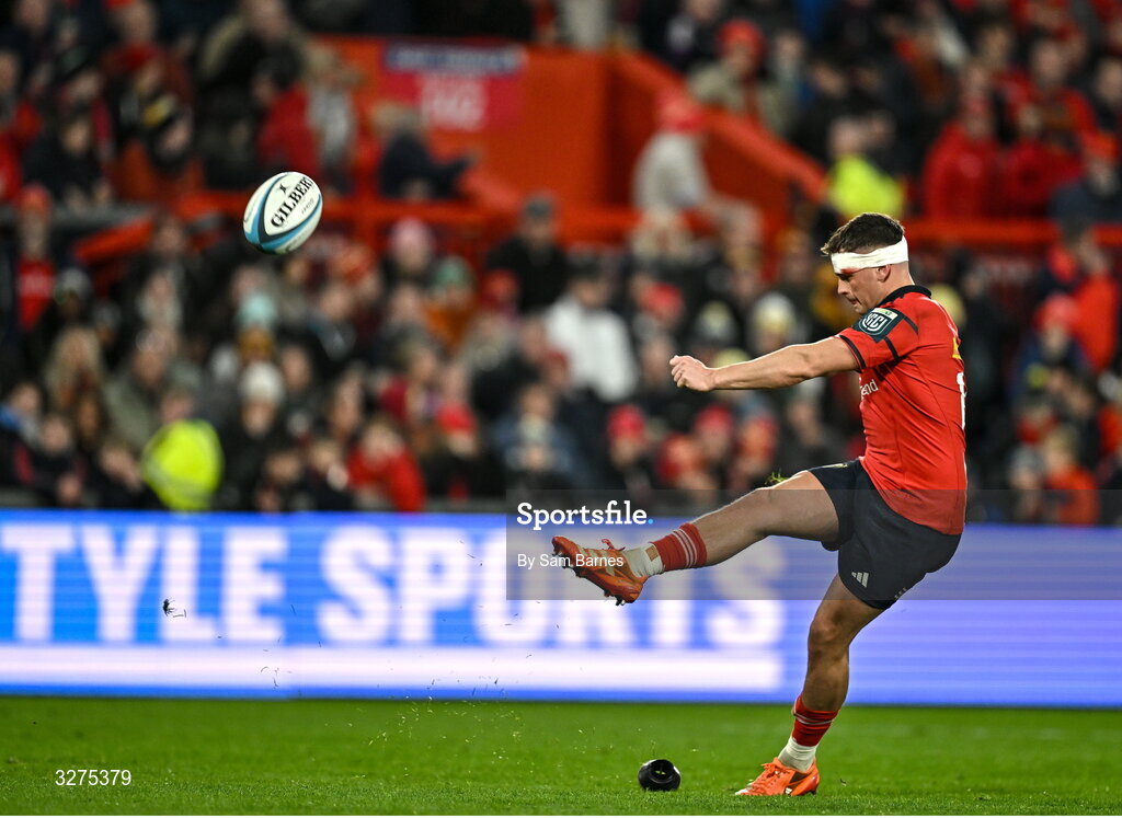1 November 2025; Tony Butler of Munster kicks a conversion during the tour match between Munster and Argentina XV at Thomond Park in Limerick. Photo by Sam Barnes/Sportsfile