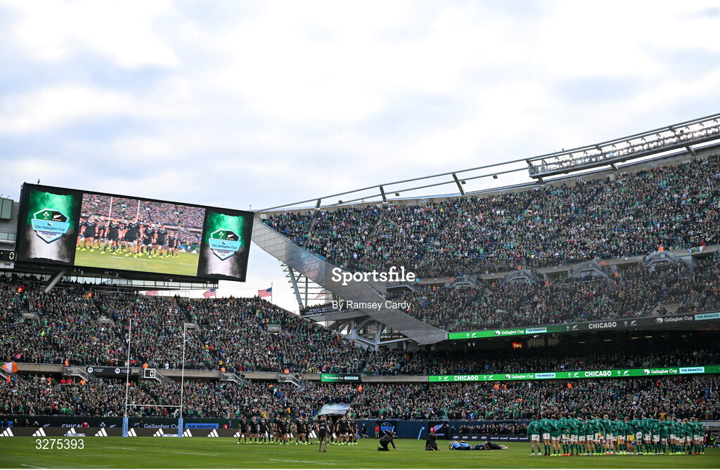 1 November 2025; New Zealand players perform the Haka before the Gallagher Cup match between Ireland and New Zealand at Soldier Field in Chicago, USA. Photo by Ramsey Cardy/Sportsfile