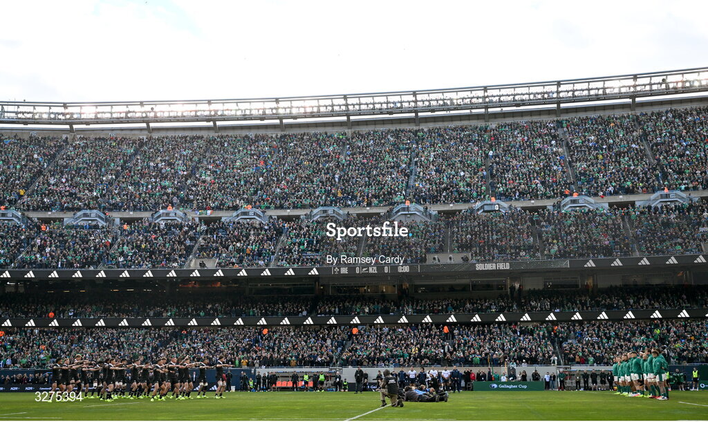 1 November 2025; New Zealand players perform the Haka before the Gallagher Cup match between Ireland and New Zealand at Soldier Field in Chicago, USA. Photo by Ramsey Cardy/Sportsfile