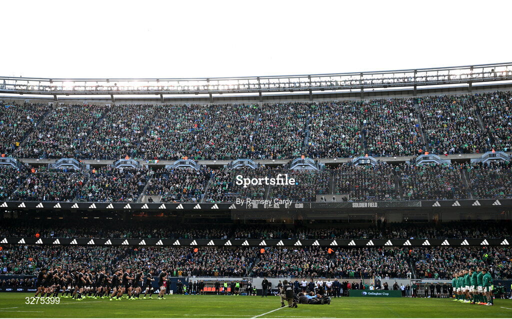 1 November 2025; New Zealand players perform the Haka before the Gallagher Cup match between Ireland and New Zealand at Soldier Field in Chicago, USA. Photo by Ramsey Cardy/Sportsfile