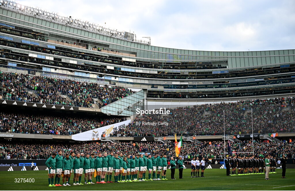 1 November 2025; Players from both side's stand for the playing of the national anthems before the Gallagher Cup match between Ireland and New Zealand at Soldier Field in Chicago, USA. Photo by Ramsey Cardy/Sportsfile