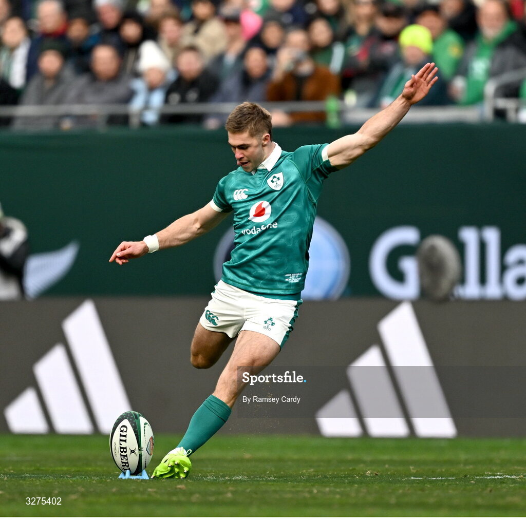 1 November 2025; Jack Crowley of Ireland kicks a penalty during the Gallagher Cup match between Ireland and New Zealand at Soldier Field in Chicago, USA. Photo by Ramsey Cardy/Sportsfile