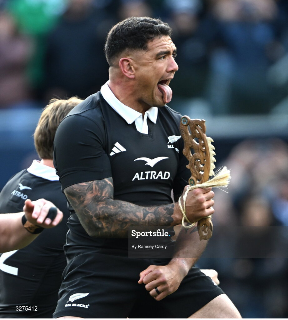 1 November 2025; Codie Taylor of New Zealand and team-mates perform the Haka before the Gallagher Cup match between Ireland and New Zealand at Soldier Field in Chicago, USA. Photo by Ramsey Cardy/Sportsfile
