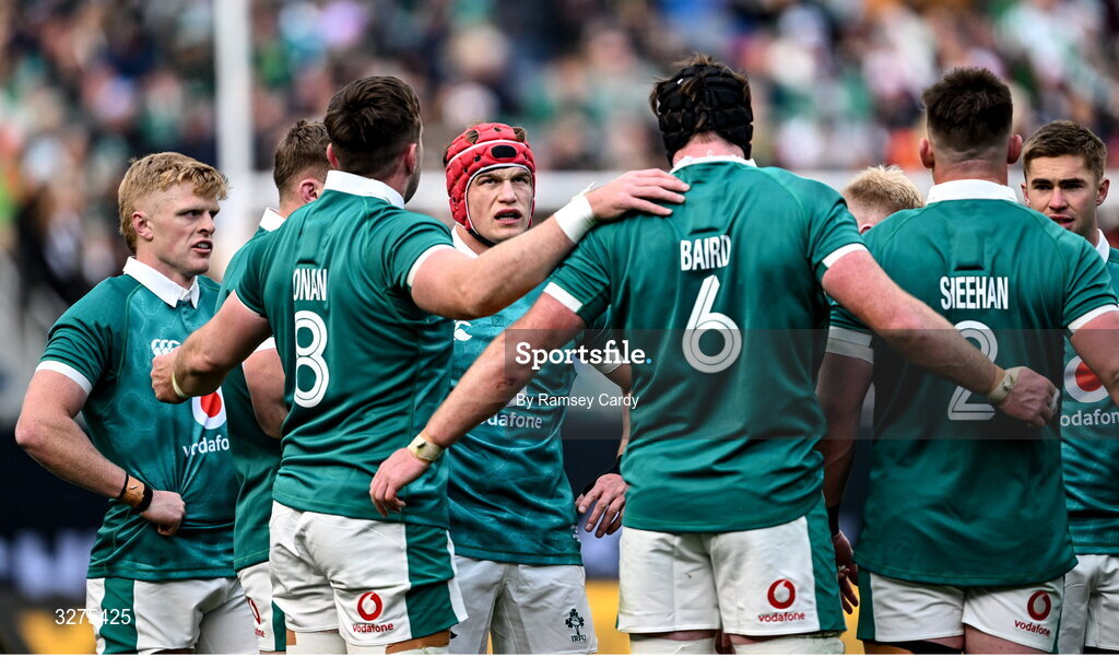 1 November 2025; Josh van der Flier of Ireland, centre, and team-mates during the Gallagher Cup match between Ireland and New Zealand at Soldier Field in Chicago, USA. Photo by Ramsey Cardy/Sportsfile