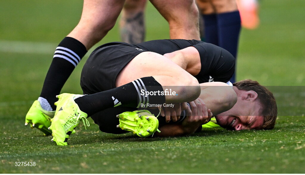 1 November 2025; Jordie Barrett of New Zealand after picking up an injury during the Gallagher Cup match between Ireland and New Zealand at Soldier Field in Chicago, USA. Photo by Ramsey Cardy/Sportsfile