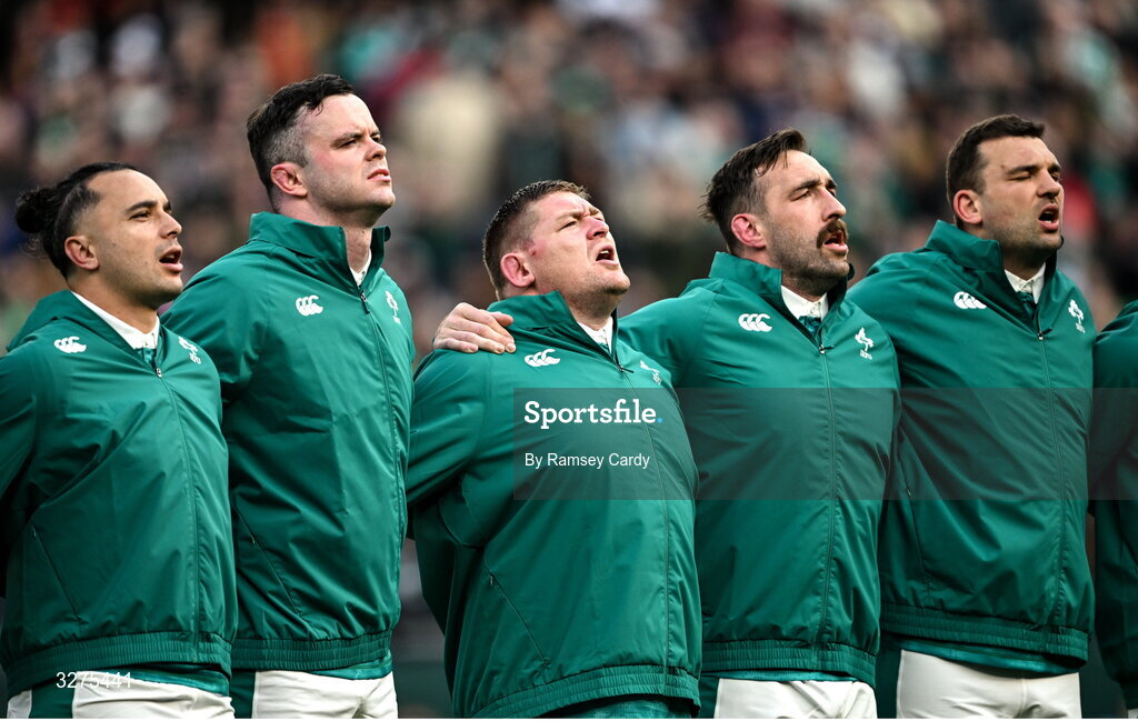 1 November 2025; Ireland players, from left, James Lowe, James Ryan, Tadhg Furlong, Jack Conan and Tadhg Beirne before the Gallagher Cup match between Ireland and New Zealand at Soldier Field in Chicago, USA. Photo by Ramsey Cardy/Sportsfile