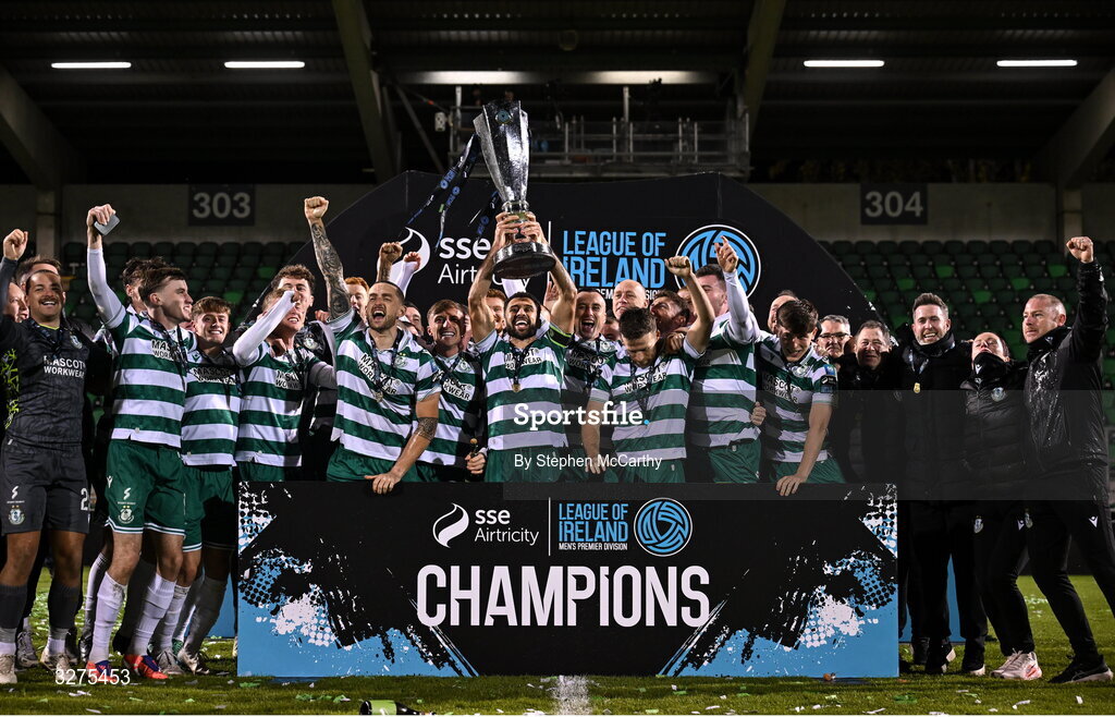 1 November 2025; Roberto Lopes of Shamrock Rovers lifts the SSE Airtricity Men's Premier Division trophy after the SSE Airtricity Men's Premier Division match between Shamrock Rovers and Sligo Rovers at Tallaght Stadium in Dublin. Photo by Stephen McCarthy/Sportsfile