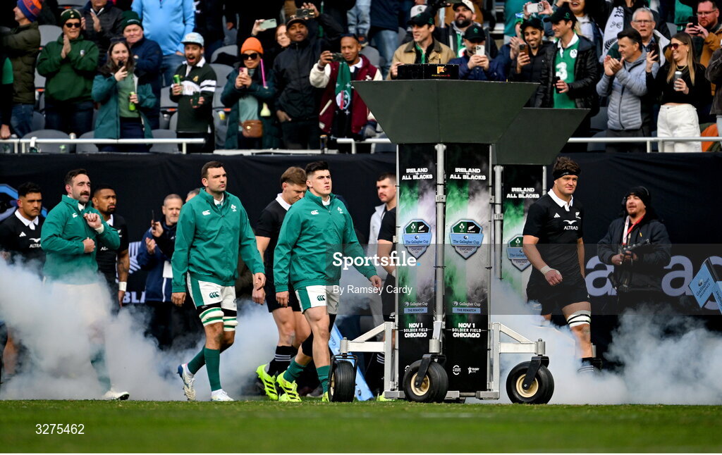 1 November 2025; Dan Sheehan of Ireland and Scott Barrett of New Zealand lead their side's onto the pitch before the Gallagher Cup match between Ireland and New Zealand at Soldier Field in Chicago, USA. Photo by Ramsey Cardy/Sportsfile