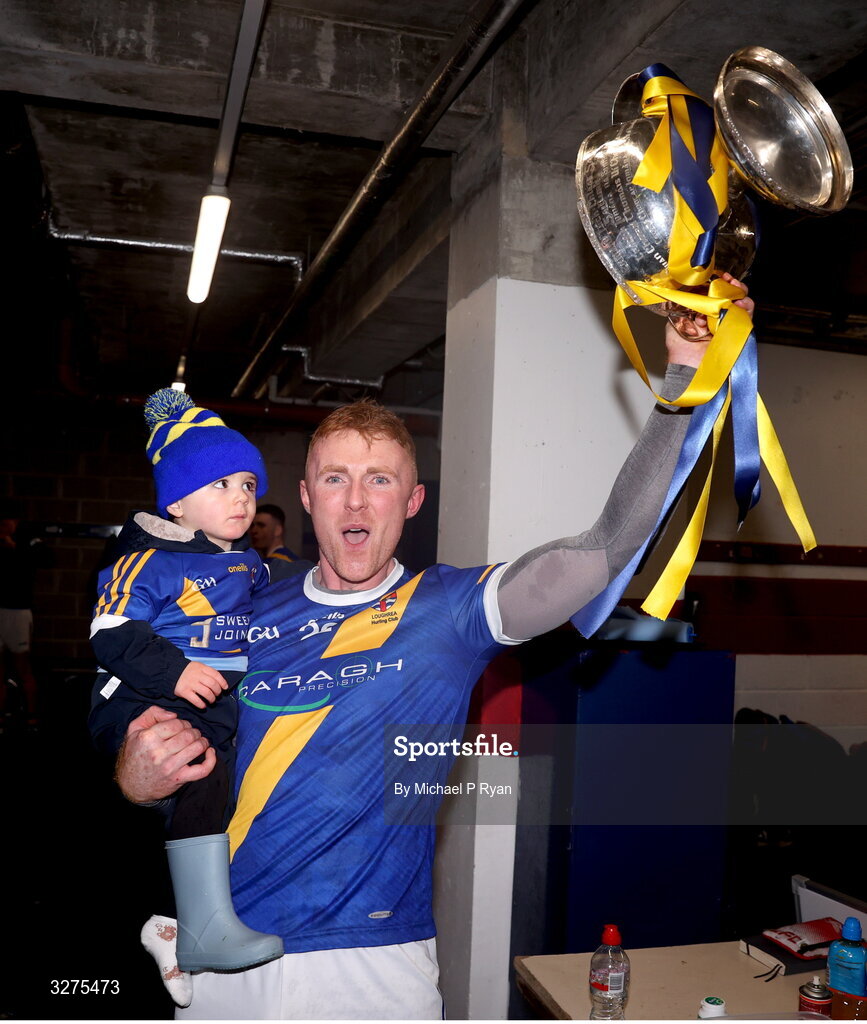 1 November 2025; Sean Sweeney of Loughrea celebrates with his son Bobby, age 1 and a half, after the Galway County Senior Club Hurling Championship final match between St Thomas' and Loughrea at Pearse Stadium in Galway. Photo by Michael P Ryan/Sportsfile