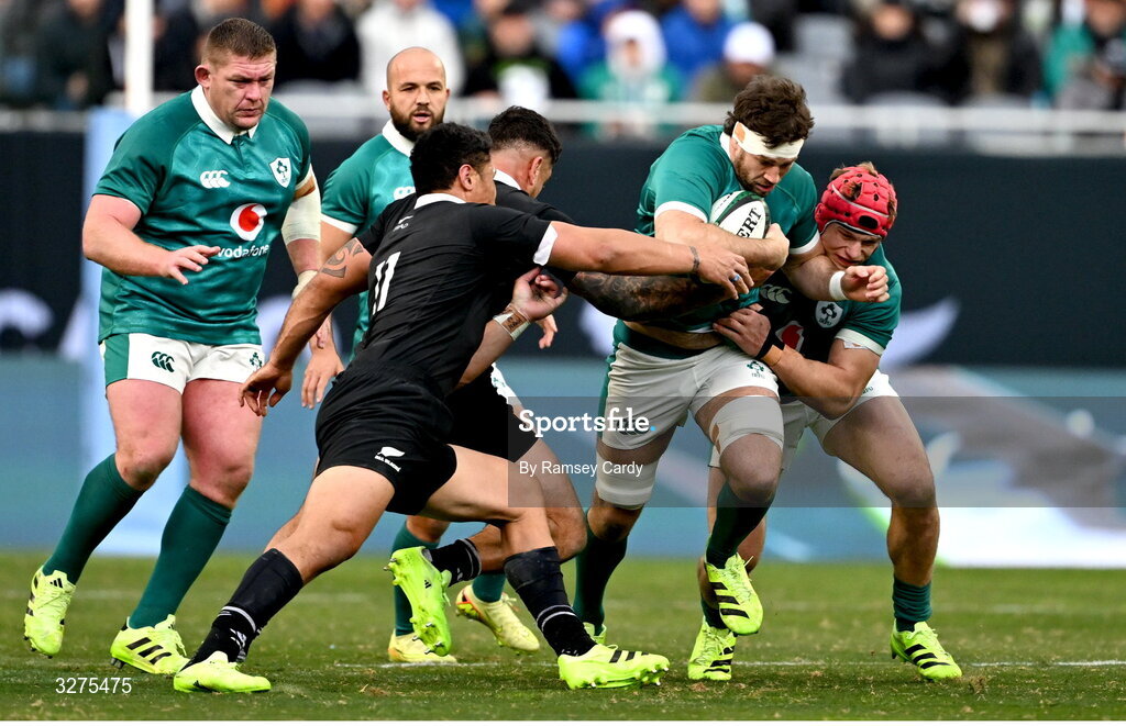 1 November 2025; Caelan Doris of Ireland is tackled by Caleb Clarke, left, and Codie Taylor of New Zealand during the Gallagher Cup match between Ireland and New Zealand at Soldier Field in Chicago, USA. Photo by Ramsey Cardy/Sportsfile