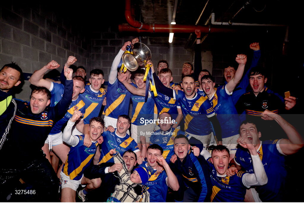 1 November 2025; Loughrea players celebrate with the Tom Callinan cup after the Galway County Senior Club Hurling Championship final match between St Thomas' and Loughrea at Pearse Stadium in Galway. Photo by Michael P Ryan/Sportsfile