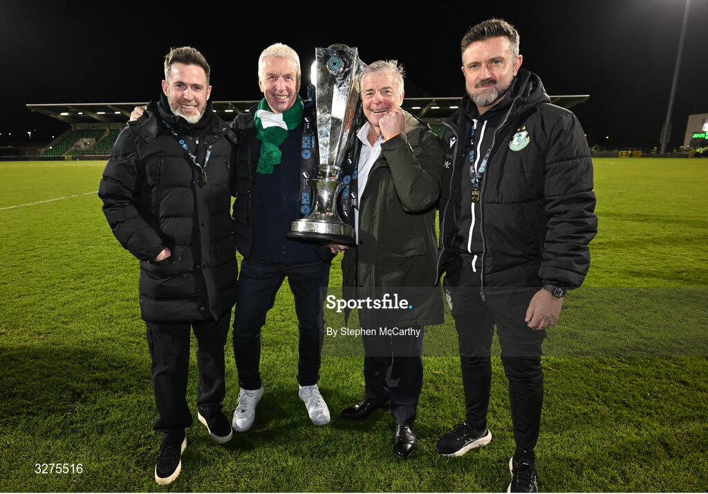 1 November 2025; Shamrock Rovers manager Stephen Bradley, left, Shamrock Rovers independent chairman Ciaran Medlar, Shamrock Rovers part owner Ray Wilson and Shamrock Rovers sporting director Stephen McPhail celebrate with the SSE Airtricity Men's Premier Division trophy after the SSE Airtricity Men's Premier Division match between Shamrock Rovers and Sligo Rovers at Tallaght Stadium in Dublin. Photo by Stephen McCarthy/Sportsfile