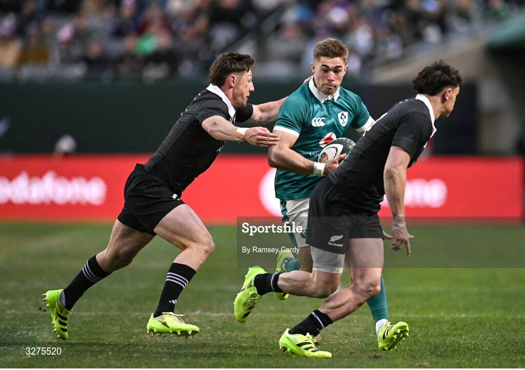 1 November 2025; Jack Crowley of Ireland is tackled by Leroy Carter of New Zealand during the Gallagher Cup match between Ireland and New Zealand at Soldier Field in Chicago, USA. Photo by Ramsey Cardy/Sportsfile