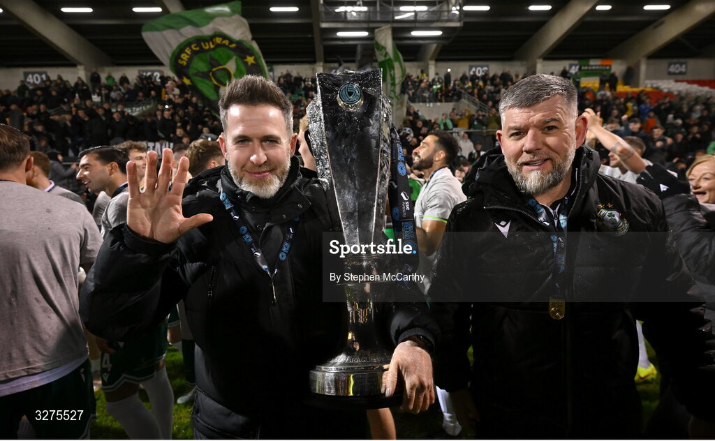 1 November 2025; Shamrock Rovers manager Stephen Bradley, left, celebrates with the SSE Airtricity Men's Premier Division trophy after the SSE Airtricity Men's Premier Division match between Shamrock Rovers and Sligo Rovers at Tallaght Stadium in Dublin. Photo by Stephen McCarthy/Sportsfile