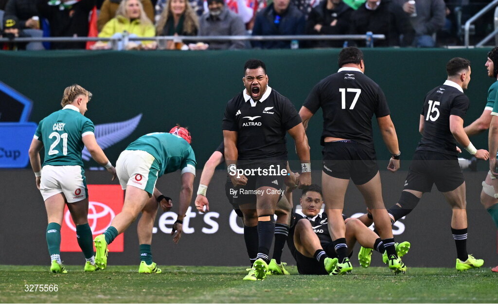 1 November 2025; Samisoni Taukei’aho of New Zealand celebrates as team-mate Cam Roigard, not pictured, scores their side's fourt try during the Gallagher Cup match between Ireland and New Zealand at Soldier Field in Chicago, USA. Photo by Ramsey Cardy/Sportsfile