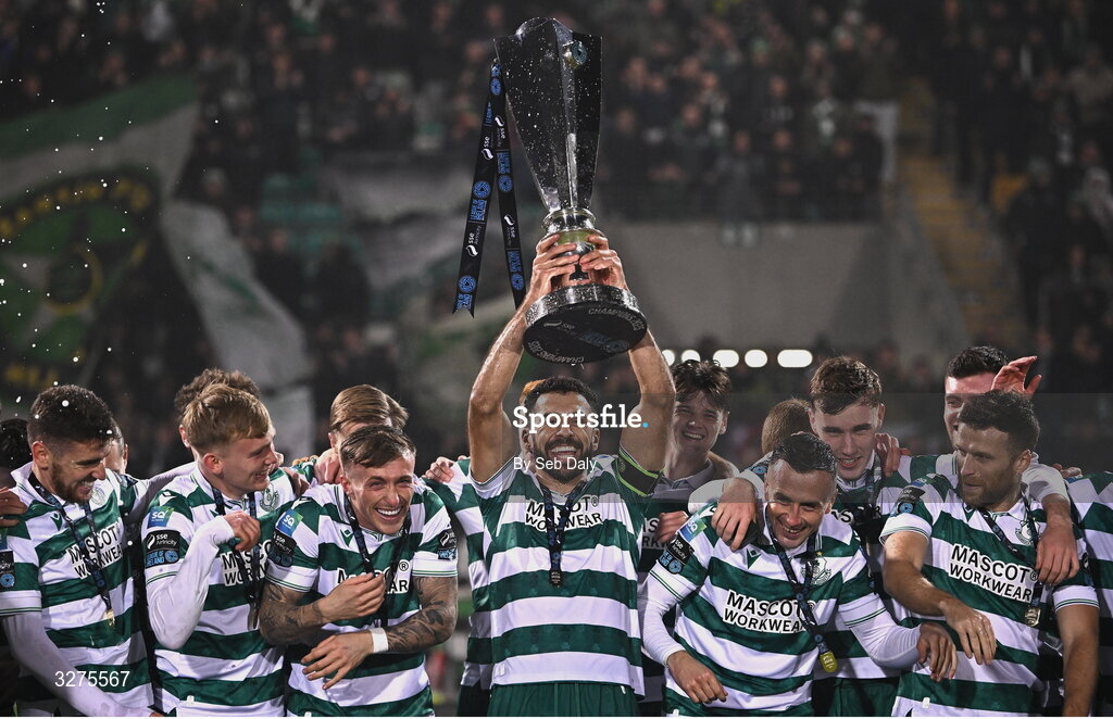 1 November 2025; Shamrock Rovers captain Roberto Lopes lift the SSE Airtricity Men's Premier Division trophy after the SSE Airtricity Men's Premier Division match between Shamrock Rovers and Sligo Rovers at Tallaght Stadium in Dublin. Photo by Seb Daly/Sportsfile